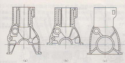 平分式气缸体-曲轴箱的结构如图2-4b所示,它的上、下曲轴箱的接合面正好与曲轴中心线保持一致。这种结构的优点是加工和拆装比较方便,但缸体刚度较差。